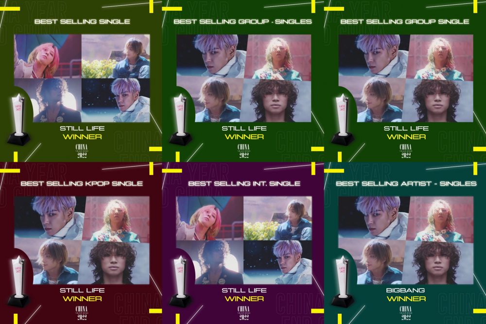BIGBANG ‘Still Life’ teklisi ile ‘En Çok Satan Sanatçı (Single)” ‘En Çok Satan Single”büyük ödülleri kazanarak Çinli isim Jay Chou‘ya katıldı. Grubun ‘Still Life’ şarkısı 1,909,981 kopya satarak JJ Lin, EXO’dan Lay ve eski üye Luhan gibi en iyi Çinli sanatçıları bile geride bırakarak en çok satan single oldu. Bu satışlar onlara toplam 6 adaylık kazandırdı ve tüm kategorilerde kazandılar!