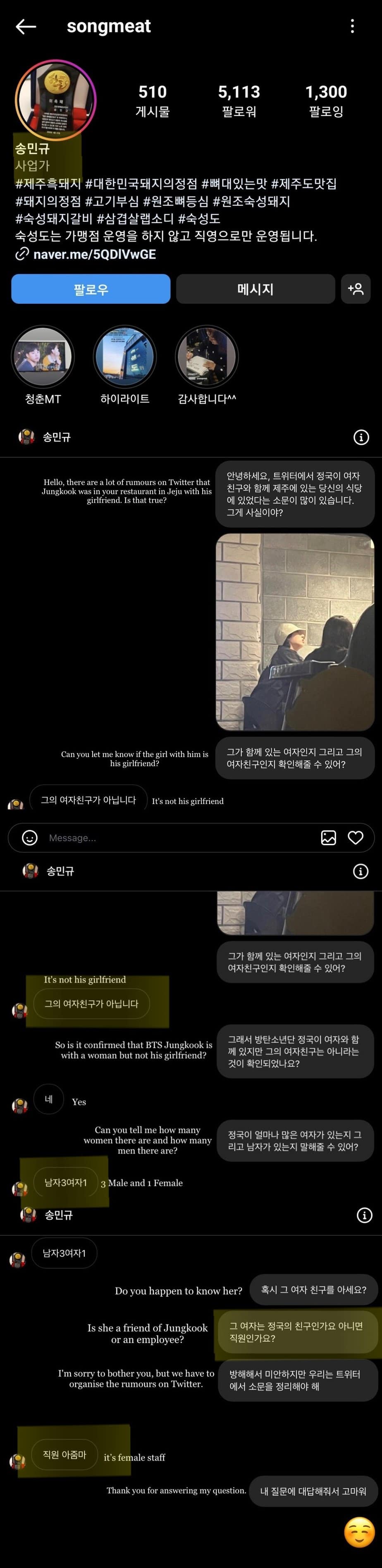 Birisi restoran sahibine mesaj yolladı ve Jung Kook‘un 3 erkek ve 1 kadınla birlikte olduğunu söyledi. Yanındaki kızın da kız arkadaşı değil kadın personel olması, ona ‘ajumma’ demesi onun da belli bir yaşta olduğunu gösteriyor.
