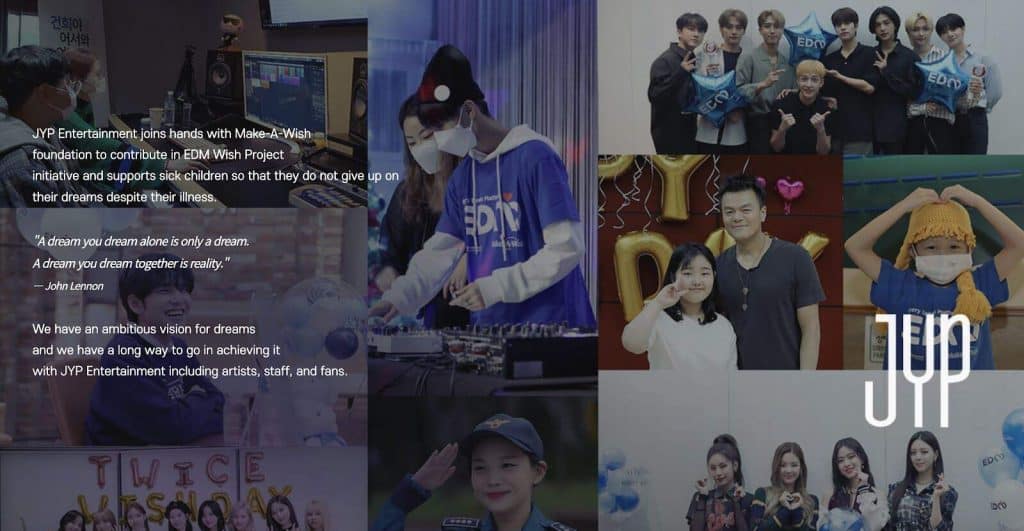 JYP Entertainment, 2019’dan beri Make-A-Wish Korea ile iş birliği yaparak tedavi edilemez hastalıkları olan çocukları destekleyen “EDM (Every Dream Matters!) [Her Hayal Önemli]” gibi projelere katılıyor.