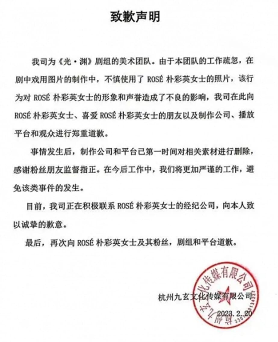 “Ekibimizin ihmali nedeniyle Rose’nin fotoğrafını dikkatsizce kullandık. Bu hareket Rose’yi ve imajını olumsuz etkiledi. Rose ve hayranlarından, yayın platformundan ve seyircilerimizden gerçekten özür dileriz.”