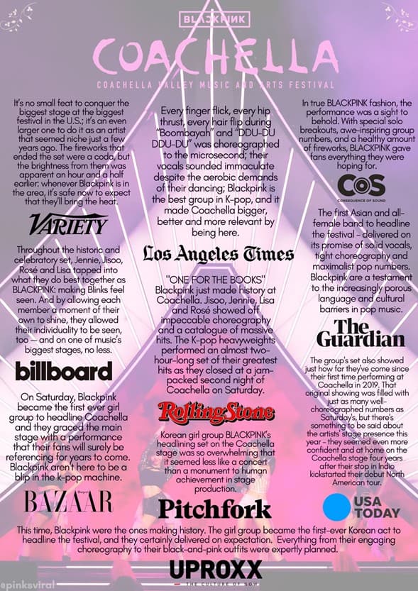 Read our review + see photos and video of their historic set: https://t.co/K6Zk8e0gWM#BLACKPINKatCoachella #PINKCHELLA pic.twitter.com/qLsWdCzMeX