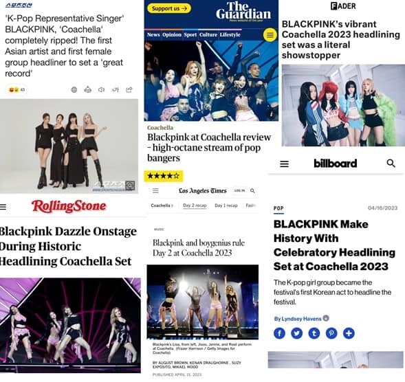 Çeşitli ülkelerden haber bültenleri BLACKPINK’in Coachella’daki performansını vurgulamaya ve hem şahsen hem de sanal olarak orada bulunan çok sayıda izleyici (250 milyon canlı izleyici ve 125 binden fazla kalabalık) karşısında şaşkınlıklarını gösterdiler.