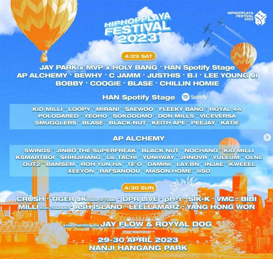 Kore’nin en büyük hip-hop festivallerinden biri olan HipHopPlaya Festivali 29-30 Nisan’da gerçekleşecek. Festival, K-hip hop alanındaki en iyi ve heyecan verici yeni yeteneklerden bazılarını bir araya getiren iki günlük bir etkinliktir. Gelişmekte olan sanatçıları da desteklemeye odaklanan bu hip hop festivali, Nanji Hangang Park’ta birden fazla sahne, yiyecek kamyonları ve ürün stantları ile birlikte düzenleniyor.. Festivalin kadrosunda Jay Park, Tiger JK, Crush, Bewhy, Bobby (iKON), B.I, SIK-K, BIBI, AP Alchemy ekibi, DPR Live, pH-1 gibi pek çok ünlü isimle birlikte 60’dan fazla hip-hop sanatçısı var.