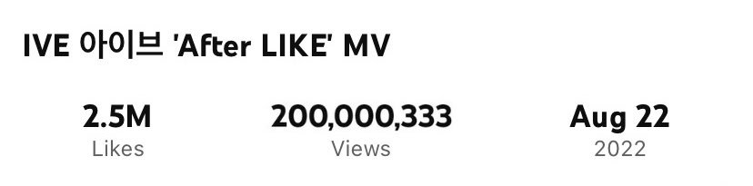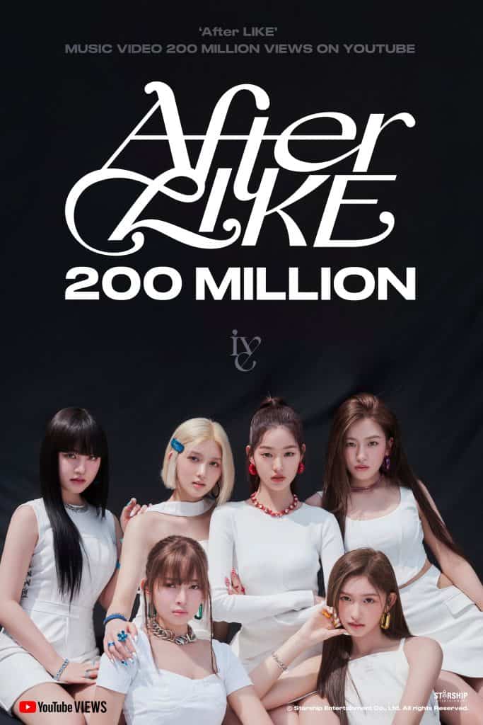 4 Mayıs saat 20.35 civarında, IVE‘ın “AFTER LIKE” müzik videosu YouTube‘da 200 milyon görüntülenmeye ulaştı. “AFTER LIKE“, IVE‘ın “LOVE DIVE“dan sonra bu dönüm noktasında ulaşan 2. şarkısı oldu.