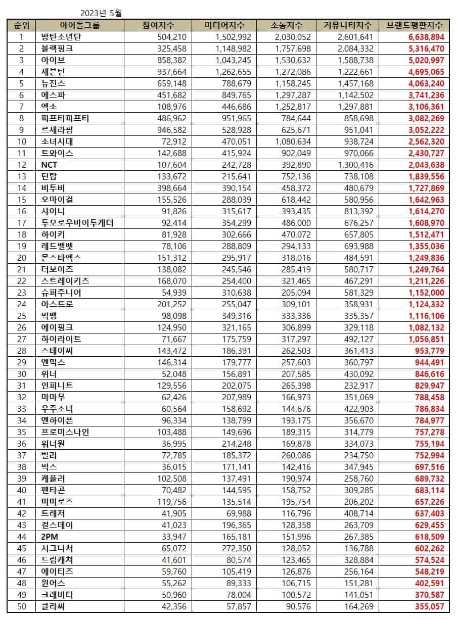 Sıralamalar, 25 Nisan – 25 Mayıs arasında toplanan büyük veriler kullanılarak, çeşitli idol gruplarının; tüketici katılımı, medyada yer alma, etkileşim ve toplum farkındalığı indekslerinin analizi yoluyla belirlendi.