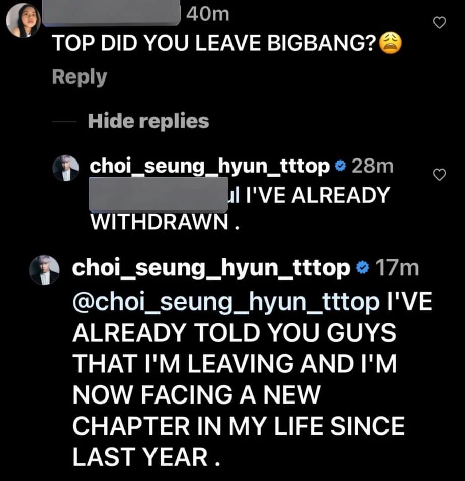 Bu yüzden bir fan sanatçının kendisine sordu. Son Instagram güncellemesinin yorum kısmına, “T.O.P., BIGBANG’den ayrıldın mı?” yazdı. T.O.P. da “Zaten ayrıldım. Size zaten ayrıldığımı ve geçen yıldan beri hayatımın yeni bir bölümüne geçiş yaptığımı söyledim.” diye cevapladı.