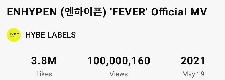 4 Haziran saat yaklaşık 09.24’te ENHYPEN‘ın hit b-side şarkısı “FEVER“ın müzik videosu, YouTube‘da 100 milyon görüntülenmeyi aşarak grubun “Drunk-Dazed“den sonra bunu başaran 2. müzik videosu oldu.