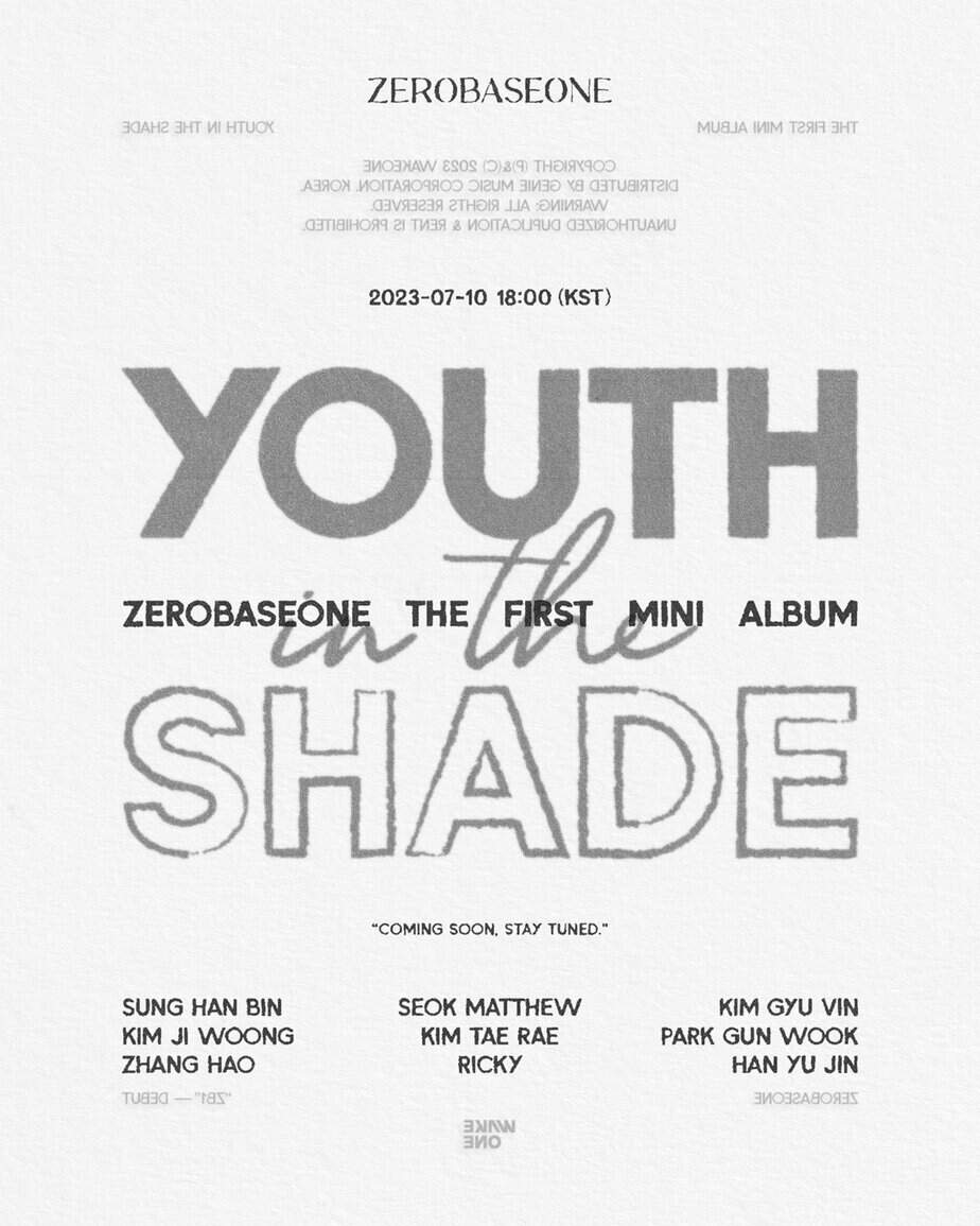 Duyuruyla birlikte ZEROBASEONE, “YOUTH IN THE SHADE” için üyelerin isimlerinin ve “ÇOK YAKINDA, TAKİP ETMEYE DEVAM EDIN” ifadelerinin yer aldığı bir teaser poster yayınladı.