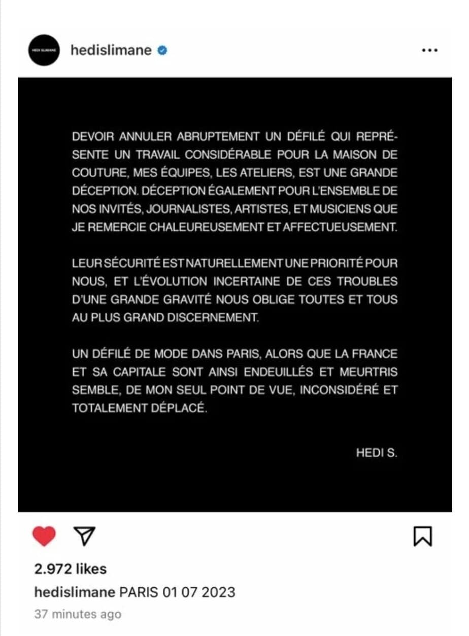 Hedi Slimane, Fransa ve başkentinin yas ve ıstırap içinde olduğu bir dönemde Paris’te bir defile düzenlemenin uygunsuz ve yersiz göründüğünü belirterek, endişelerini Fransızca olarak Instagram’da dile getirdi.