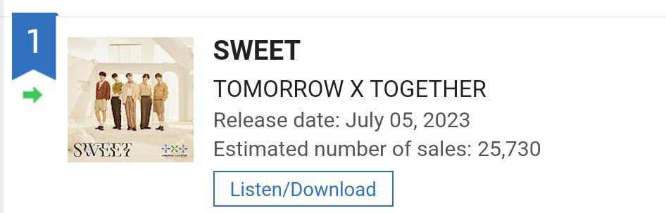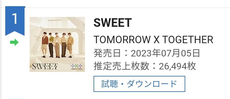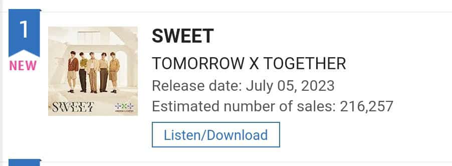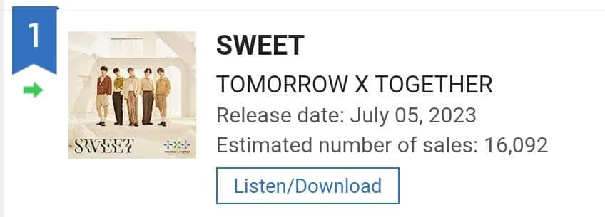 6 Temmuz’da TXT‘nin 2. Japonca albümü “SWEET”, yalnızca Japonya’daki ilk gününde 216.257 kopya satarak Oricon‘un Günlük Albüm Listesi‘nde (4 Temmuz tarihli) 1 numaradan giriş yaptı; bu, grubun Japonca albümü “STILL DREAMING”in ilk günkü satışlarının 3 katından fazla.