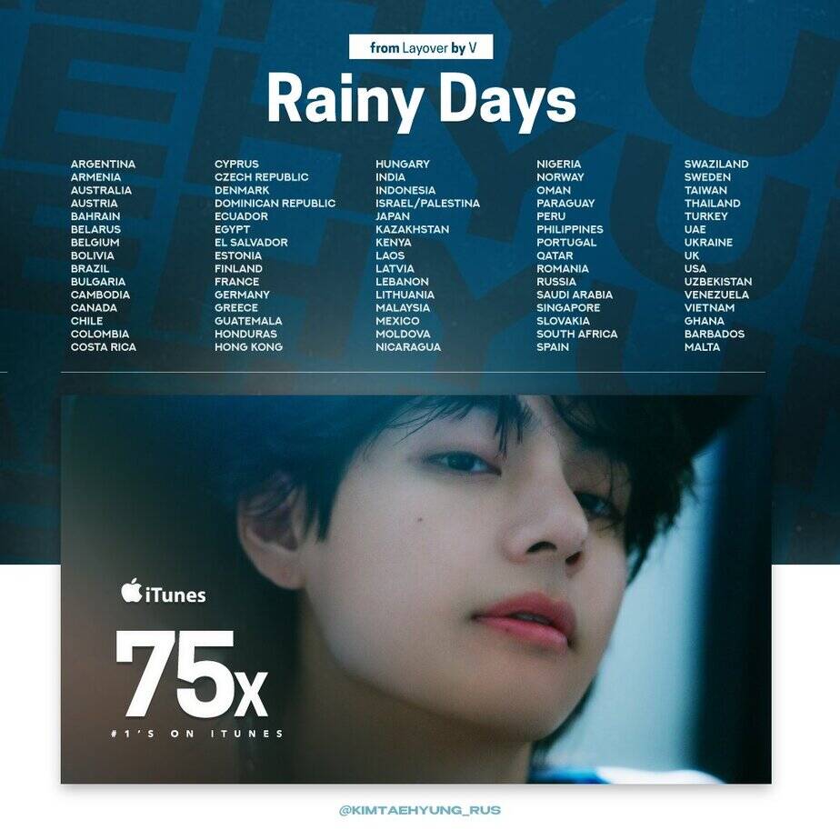 12 Ağustos’ta Rainy Days; Amerika Birleşik Devletleri, Birleşik Krallık, Japonya, Almanya ve Fransa da dahil olmak üzere en az 75 farklı ülke ve bölgede iTunes En İyi Şarkılar listelerinde 1 numaraya ulaştı.