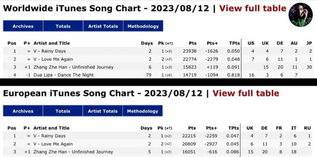 Ayrıca Rainy Days ve Love Me Again, Dünya Çapında iTunes Şarkı Listesi ile Avrupa iTunes Şarkı Listesi‘nde zirvenin ilk iki sırasını paylaşıyor.