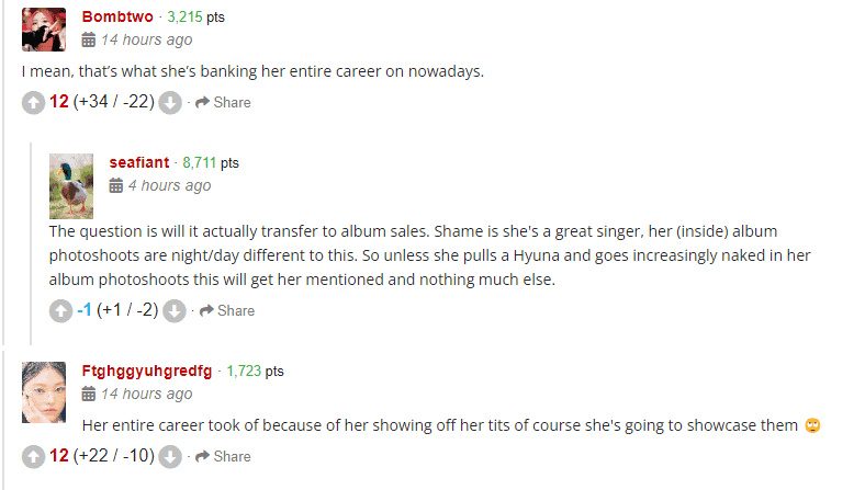 Allkpop’ın konuyla ilgili paylaştığı habere yapılan yorumlardan en çok beğeni alanlar da Instiz’deki yorumlardan aşağı kalmadı. Eun Bi’nin kariyerini göğüslerini göstermek üzerine inşa ettiği ve kendisini pazarladığı gibi yorumlar yapıldı.