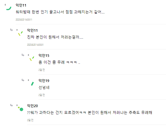 Instiz’de açılan başlığın altında Eun Bi’nin Waterbomb’da popüler olduktan sonra dekolteyi abarttığı, ilgi çekmek için dekolte giyindiği yönünde yorumların yanı göğüslerinin estetikli olup olmadığı gibi haddi aşan sorular da paylaşıldı. Elbette Eun Bi’nin istediği gibi giyinebileceğini, dekoltenin kendisine yakıştığını ve tepki verenlerin yalnızca nefret yorumcuları olduğunu savunan yorumlar da oldukça fazlaydı.