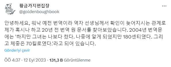 Merhaba, çok eski bir çeviri olduğu için çevirmenimizi kontrol etmemiz uzun sürdü. Bu yüzden emin olmak için yirmi yıl önceki orijinal çeviri metnini buldum. 2004 yılı çeviri metninde “Fakat o, benden uzundu. Sonradan öğrendiğime göre 180 santimdi. Ayrıca 70 kiloydu.” yazıyor.