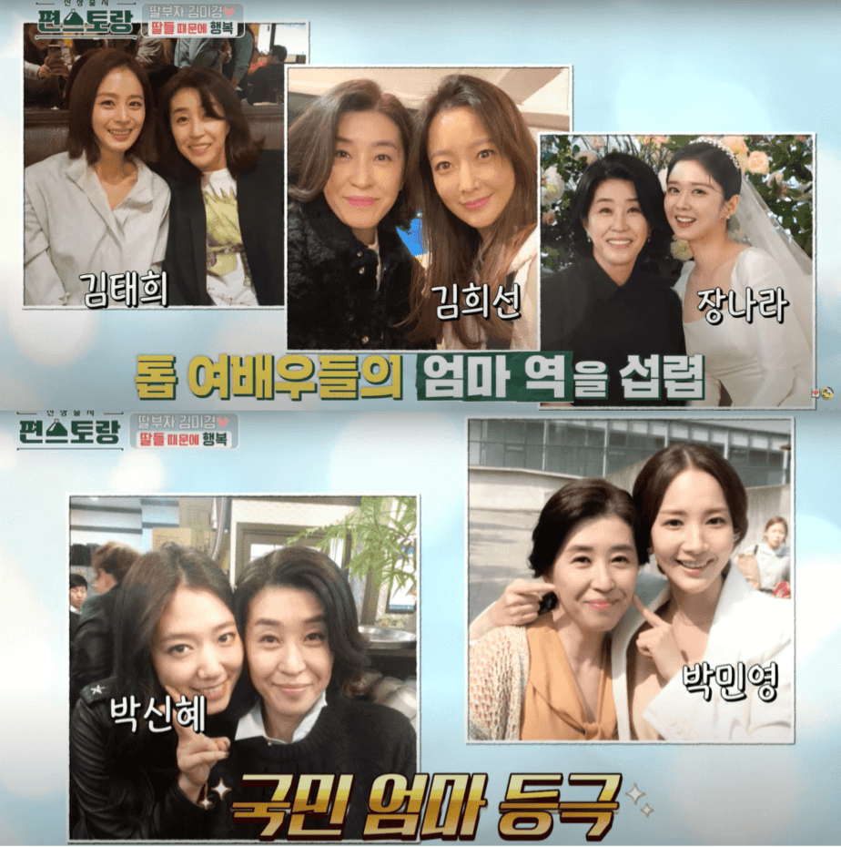 Geçtiğimiz günlerde Stars’ Top Recipe at Fun-Staurant programına konuk olan oyuncu Kim Mi Kyung, rol aldığı dizilerde kızlarını oynayan oyunculardan bahsetti. Park Shin Hye’nin kendisine hâlâ “anne” dediğini, Jang Na Ra ile ne kadar iyi anlaştıklarını ve hatta bazı oyuncuların kocasına da “baba” dediklerini anlattı.