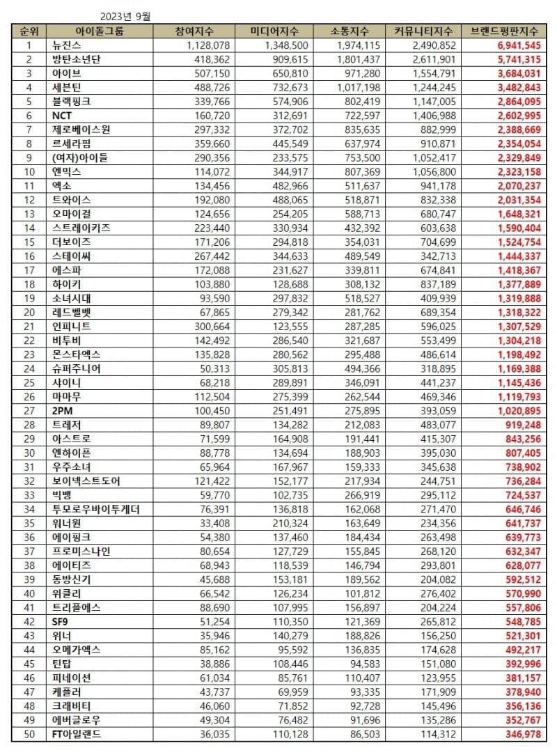 Sıralamalar, 14 Ağustos – 14 Eylül arasında toplanan büyük veriler kullanılarak, çeşitli idol gruplarının; tüketici katılımı, medya kapsamı, etkileşim ve toplum farkındalığı indekslerinin analizi yoluyla belirlendi.