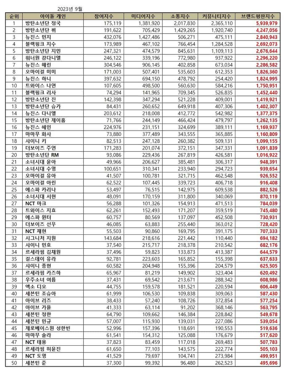 Sıralamalar, 26 Ağustos – 26 Eylül arasında toplanan büyük veriler kullanılarak, 1.720 idolün; tüketici katılımı, medya kapsamı, etkileşim ve toplum farkındalığı indekslerinin analizi yoluyla belirlendi.