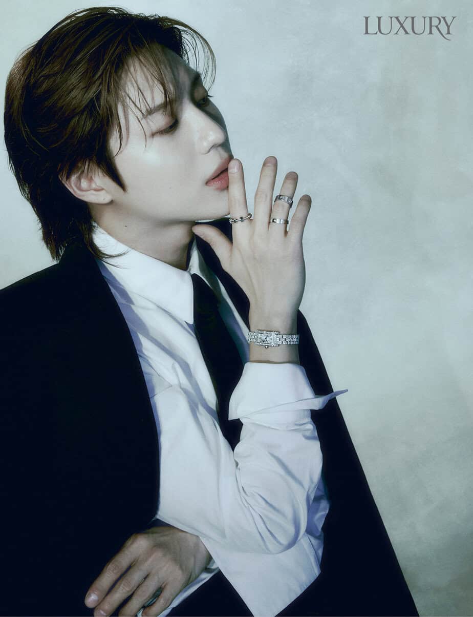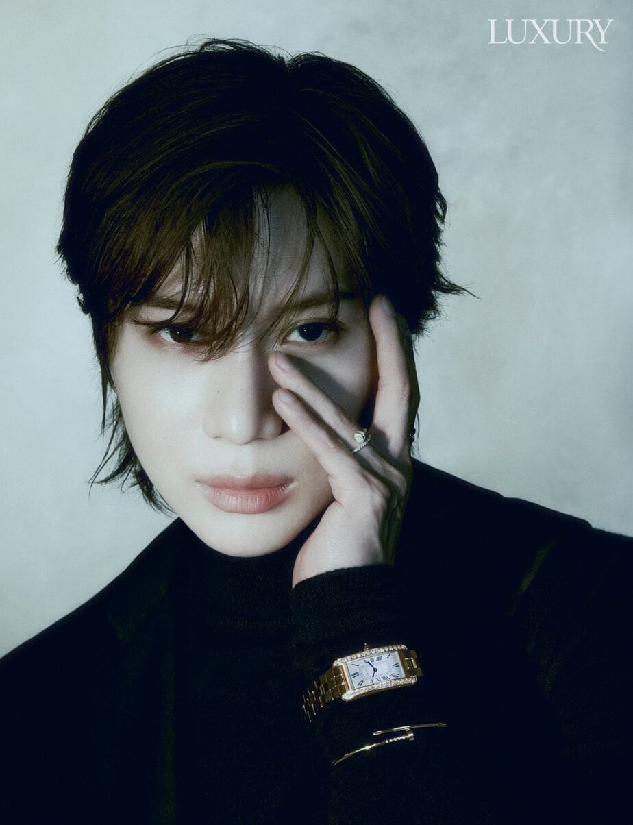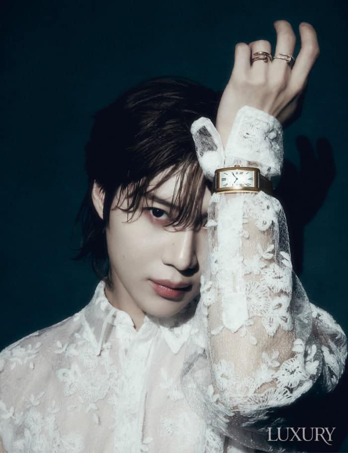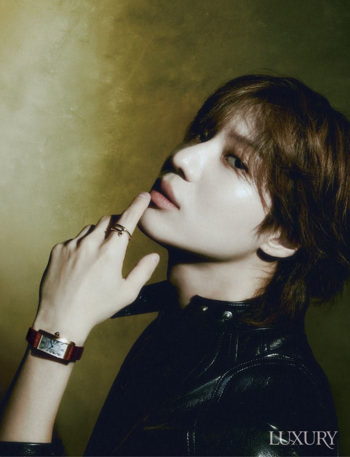 Fotoğrafta Taemin bir prense benziyor, Cartier Tank Americaine kol saatiyle olgun ve şık görünüyor.