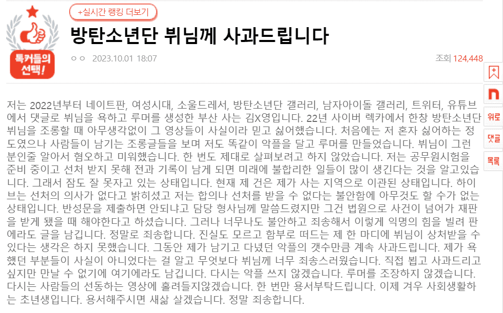 Ben 2022 yılından beri Nate Pann, Yeoseong-Sidae, Soul Dresser, DC Inside’nin BTS ve Erkek İdol galerileri, Twitter ve YouTube yorumları aracılığıyla V’ye hakaret eden ve hakkında dedikodular yayan Kim … Young’um. 2022 yılında bir YouTuber’in uzun süre BTS V ile alay ettiği videolar yayımladığı sırada düşüncesizce o videoların gerçek olduğuna inandım ve (V’den) nefret ettim. Başta kendi başıma nefret ederken insanların paylaşımlarını gördükçe ben de aynı onlar gibi kötü yorumlar yazmaya ve dedikodular üretmeye başladım. V’nin kötü biri olduğuna inandıkça ondan tiksindim, nefret ettim. Bir kere olsun doğru düzgün araştırma yapmadım. Kamu personeli sınavına hazırlandığım için hüküm giyemeyeceğimi, yoksa sabıka kaydım olacağını ve bunun gelecekte de sık sık engel olarak karşıma çıkacağını biliyorum. Bu yüzden gözüme uyku bile girmiyor. Dosyam yaşadığım bölgedeki yetkili makamlara iletilmiş durumda. HYBE’nin şikâyetini geri çekmemekte ısrar edeceğini öğrendim, bense ceza almamam gerektiği ve uzlaşılsa bile suçlu olduğu sabit olan biri olamayacağım için çok endişeliyim ama elimden hiçbir şey gelmiyor. Özür yazısı yayımlasam olmaz mı, diye ifademi alan polise sorduğumda dava mahkemeye taşındığında yayımlamam gerektiğini söyledi. Buna rağmen çok endişeli ve mahcup olduğum için böyle anonim olmanın gücüne dayanarak Pann’a yazıyorum. Gerçekten özür dilerim. Gerçek olup olmadığını bile bilmeden rastgele yazdıklarım yüzünden V’nin incinebileceğini düşünemedim. Bunca zaman yazıp durduğum nefret yorumları için sayısız kez özür dilerim. Hakaret ettiğim konuların gerçek olmadığını öğrendim, bu yüzden her şeyden önce V’den özür dilerim. Bir daha dedikodu yaymayacağım. Bundan sonra her gördüğüm YouTube videosuna inanmayacağım. Bir defalığına affınıza sığınıyorum. Toplum hayatına yeni atılan genç bir insanım. Beni affederseniz yeni bir insan olacağım. Gerçekten özür dilerim.