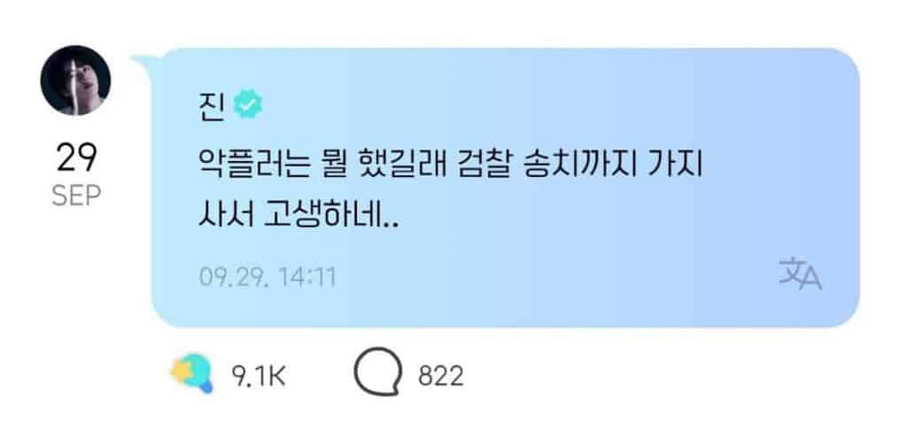 Yorumda Jin’in bir Weverse paylaşımının ekran görüntüsü vardı. Jin’in paylaşımında art niyetli sosyal medya yorumcuları ile ilgili olarak “Nefret yorumcuları ne yapmışlar da savcılığın karşısına çıkıyorlar? Vah vah, hayatları zor…” yazdığı görülüyor.