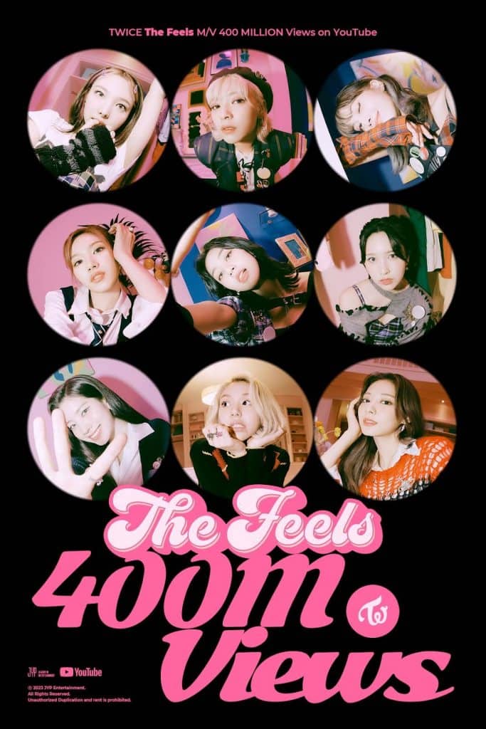 JYP Entertainment‘a göre TWICE‘ın 2021 hiti “The Feels“in müzik videosu, 13 Ekim Türkiye saatine göre 17.00 civarlarında YouTube‘da 400 milyon izlenmeye ulaştı.