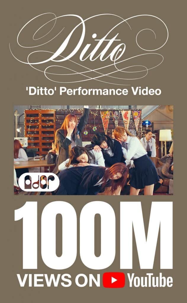 15 Ekim yaklaşık 06.40’ta, NewJeans‘in “Ditto” müzik videosundan yaklaşık 2 hafta sonra yayımlanan “Ditto Performans Videosu” YouTube‘da 100 milyon izlenme sayısını aşarak grubun bunu başaran “Hype Boy Resmi MV (Performans Ver. 1)“, “OMG Resmi MV (Performans Ver. 1)” ve “Super Shy“dan sonra bunu başaran 4. videosu oldu.