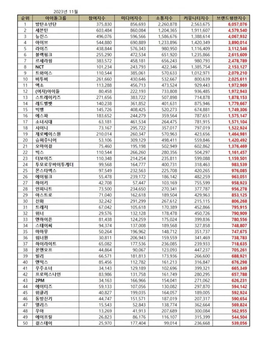 Sıralamalar, 16 Ekim – 16 Kasım arasında toplanan büyük veriler kullanılarak, çeşitli idol gruplarının; tüketici katılımı, medya kapsamı, etkileşim ve toplum farkındalığı indekslerinin analizi yoluyla belirlendi.
