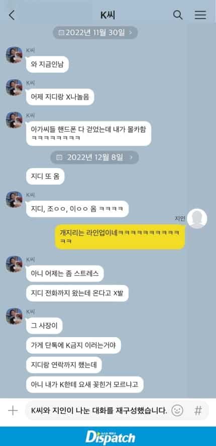 Bu arada ‘K’nin telefonunda G-Dragon’ın geçen yıl ‘G’ adlı kuruluştaki görüntüleri de vardı. ‘K’ bir arkadaşına G-Dragon’ın işyerini ziyaret ettiğini ve G-Dragon’ın partisinin çekime izin verilmemesi yönündeki taleplerine rağmen onu izinsiz olarak filme aldığını söyleyerek övündü.