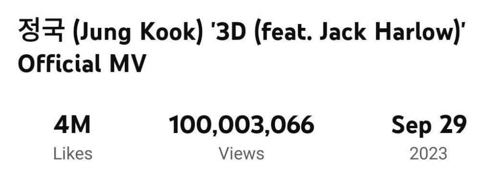 21 Aralık’ta akşam 20:45 civarında, Jung Kook‘un solo teklisi 3D (feat. Jack Harlow) müzik videosu YouTube’ta 100 milyon izlenme sayısını aştı.