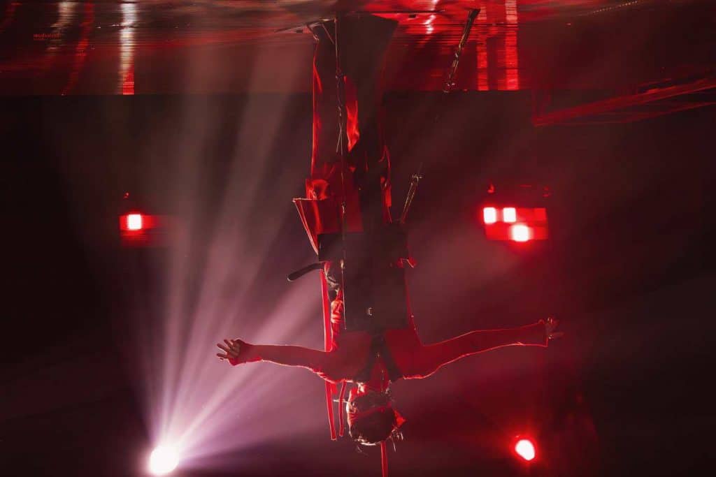 Taemin, “Door” performansında da baş aşağıydı, hatta gözleri bağlıydı.