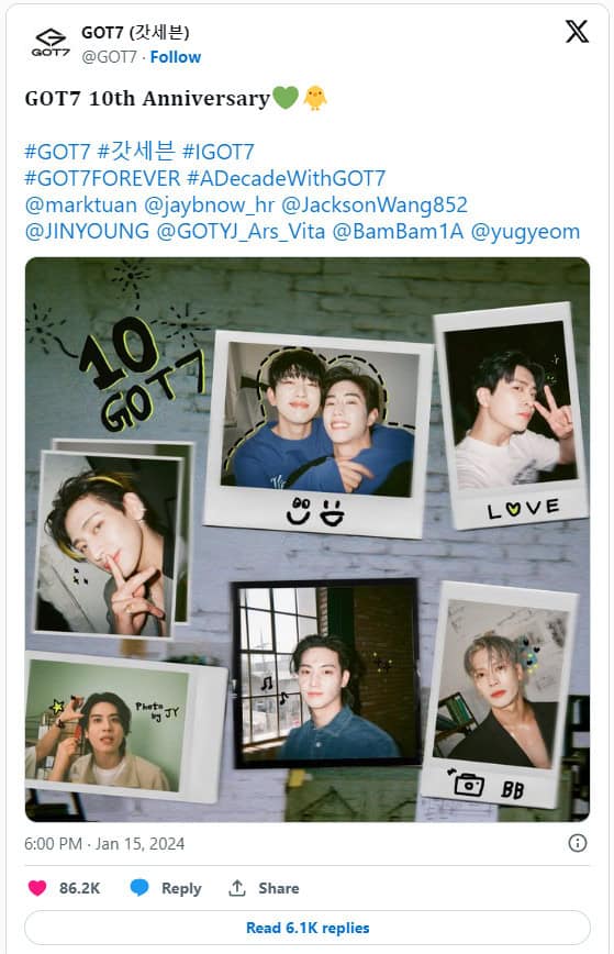 GOT7, müzik sahnesine “Girls Girls Girls” single’ları ile 16 Ocak 2014’te adım attı ve şimdi fandomları ‘Agase’ ile birlikte 10. yıl dönümünü kutluyor.