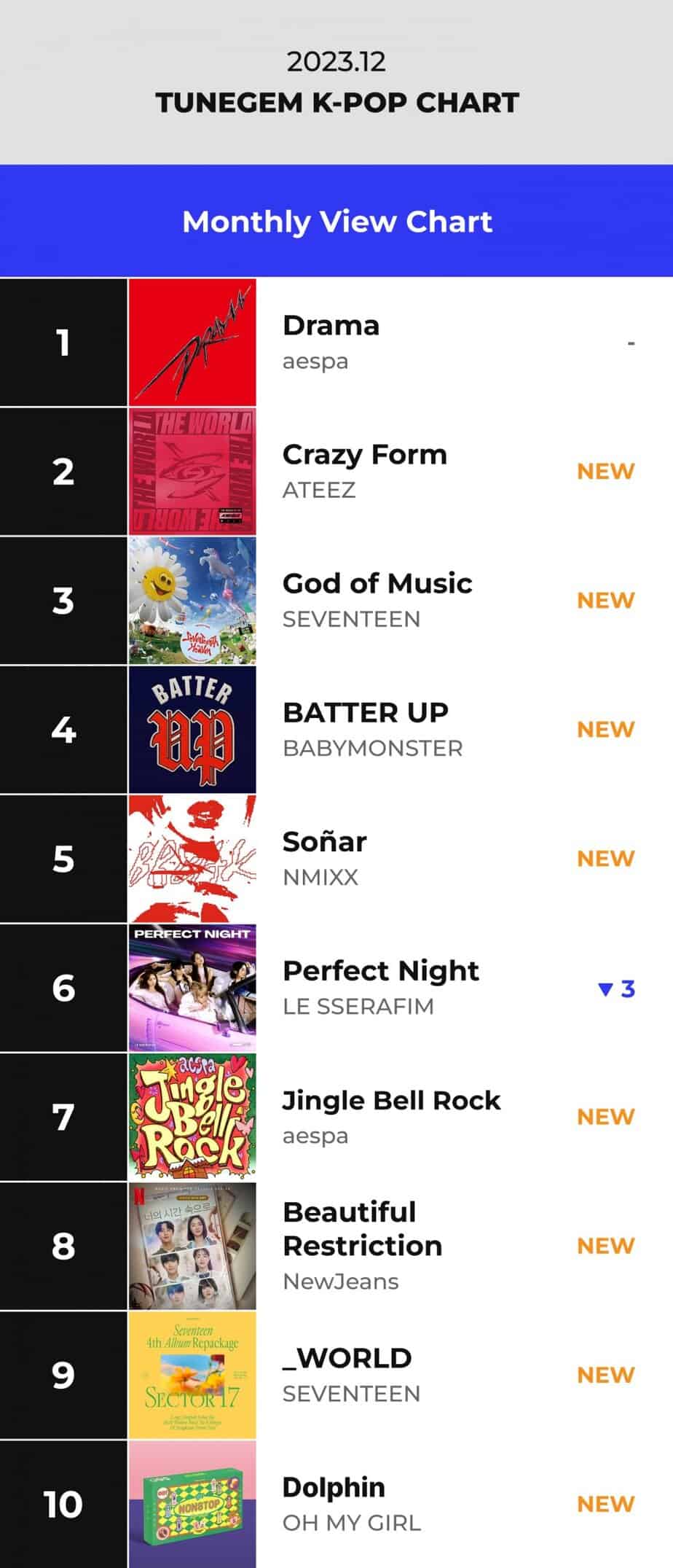 aespa’nın “Drama” adlı şarkısı, zirvedeki yerini korurken, ATEEZ‘in “Crazy Form” adlı şarkısı 10 milyon izlenmeye ulaşarak ikinci sıraya yükseldi.