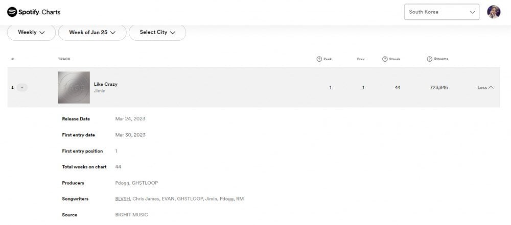 Jimin, şu anda (dünya çapındaki tüm sanatçılar düşünüldüğünde) Spotify Güney Kore Günlük En İyi Sanatçılar listesinde 200 günden fazla 1 numarada yer alan tarihteki tek solo sanatçı. Bu başarıya 21 Ocak 2024 tarihli listede ulaştı. Ayrıca, 19-25 Ocak haftası itibarıyla Spotify Güney Kore Haftalık En İyi Sanatçılar listesinde 31 hafta boyunca 1 numarada yer aldı ve bu haftalık listede bu kadar uzun süre 1 numarada kalan ilk ve tek solo sanatçı olmaya devam ediyor.