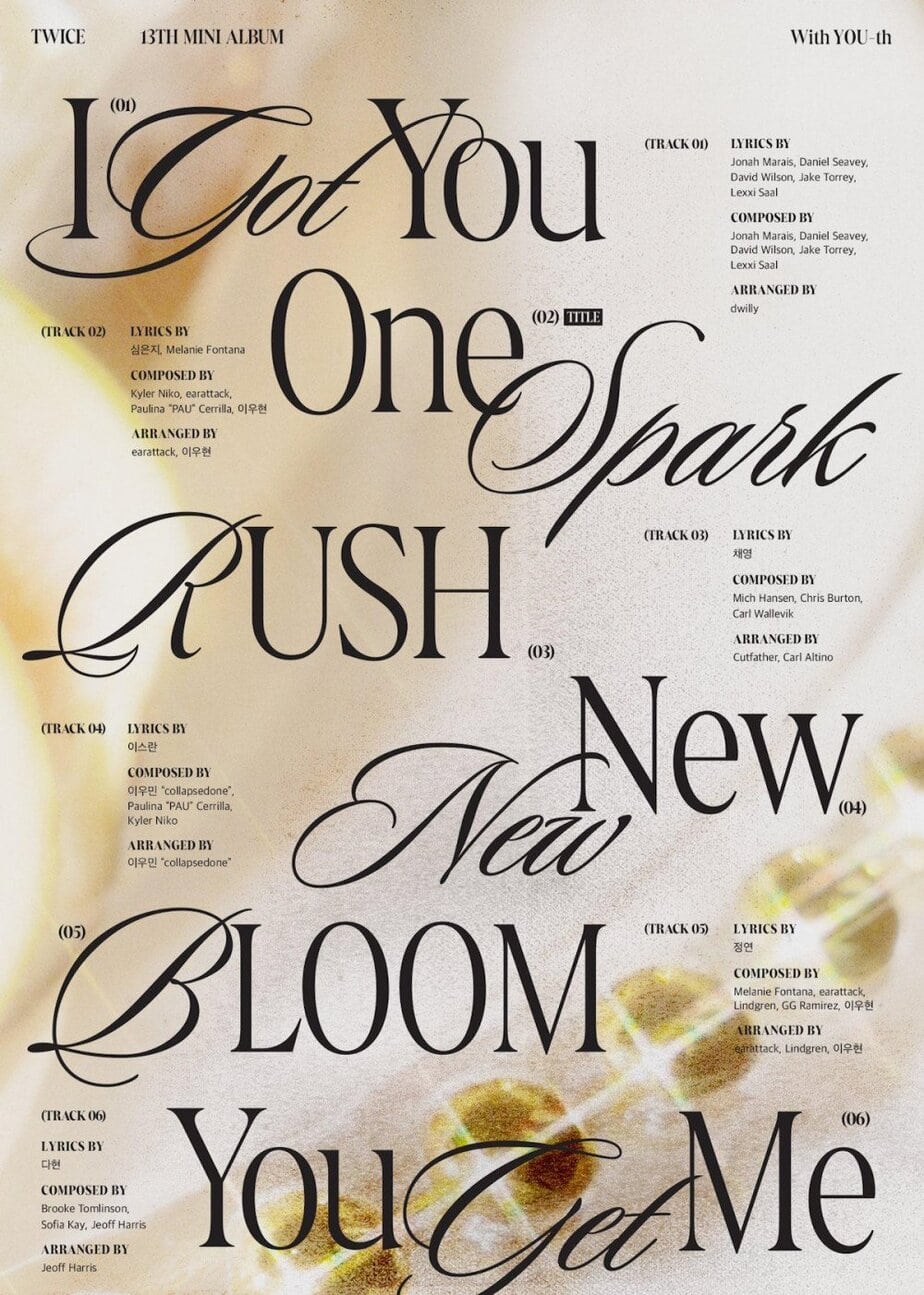 JYP‘nin kız grubu TWICE, 13. mini albümü “With YOU-th” ile 23 Şubat’ta geri dönecek. “With YOU-th“, yayım öncesi teklileri “I GOT YOU” ve başlık şarkıları “One Spark” dahil olmak üzere toplam 6 şarkıdan oluşacak.