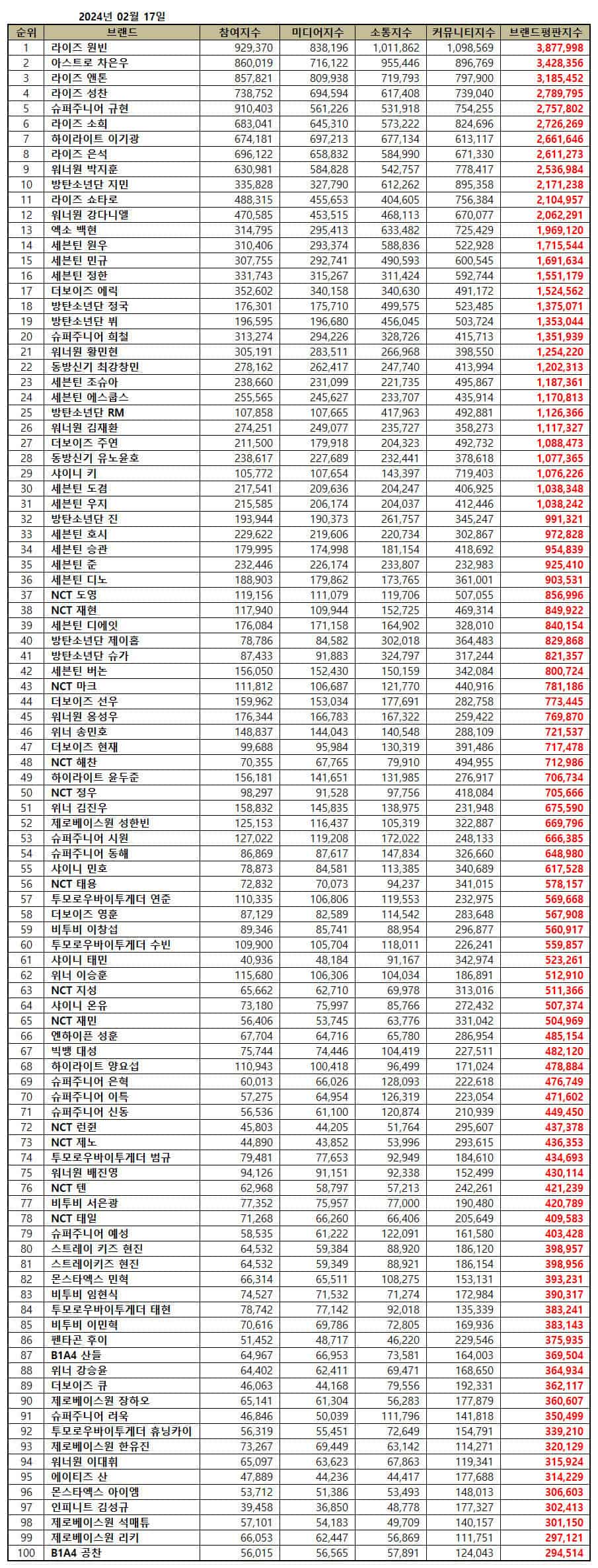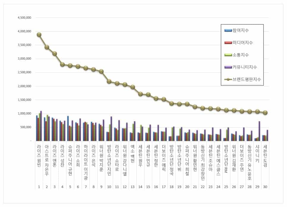 17 Ocak – 17 Şubat tarihleri arasında, Korea Brand Reputation Research Institute, tüketici katılımı, medya aktivitesi, iletişim ve topluluk aktivitesi gibi alanlarda faaliyet gösteren 724 erkek K-Pop idolünün büyük verilerini analiz etti.