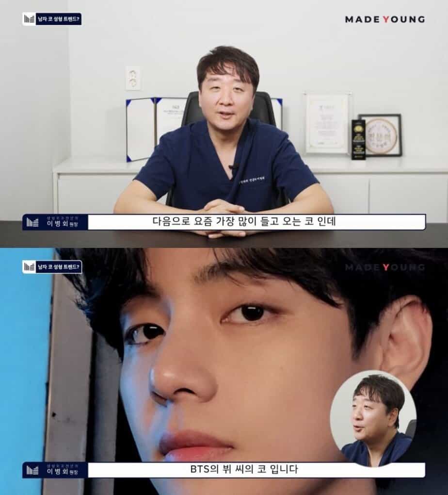 Dr. Lee Byung-hoe, erkeklerin köprüden uca düz uzanan doğal görünümlü, erkeksi bir burun tercih ettiğini açıkladıktan sonra, “Sırada bugünlerde en çok gündeme gelen burun var. BTS’ten V’nin burnu,” dedi.
