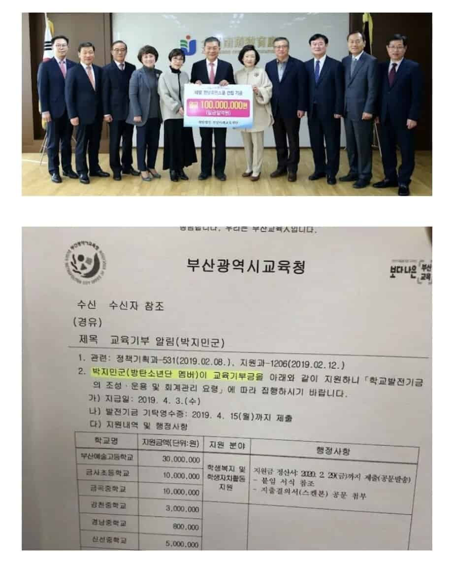 Geçmişte Jimin, eğitim giderlerinin desteklenmesine büyük ilgi gösterdi. 2018 yılında mezun olduğu Busan Hodong İlköğretim Okulu‘ndaki öğrencilerinin üniforma masraflarını karşıladı. Ertesi yıl, düşük gelirli ailelerden gelen öğrencileri destekleyerek Busan Metropolitan Şehri Eğitim Ofisi’ne 100 Milyon WON katkıda bulundu. Ek olarak, Jeonnam Gelecek Eğitim Vakfı‘na ve Gangwon İl Eğitim Ofisi‘ne 100’er Milyon WON bağışlayarak yerel topluluklara olan bağlılığını gösterdi.