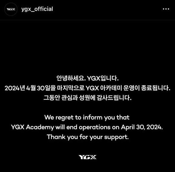 YG Entertainment bünyesindeki dans okulu YGX Academy, 30 Nisan akşamı yaptığı duyuru ile faaliyetlerine son verdiğini açıkladı.