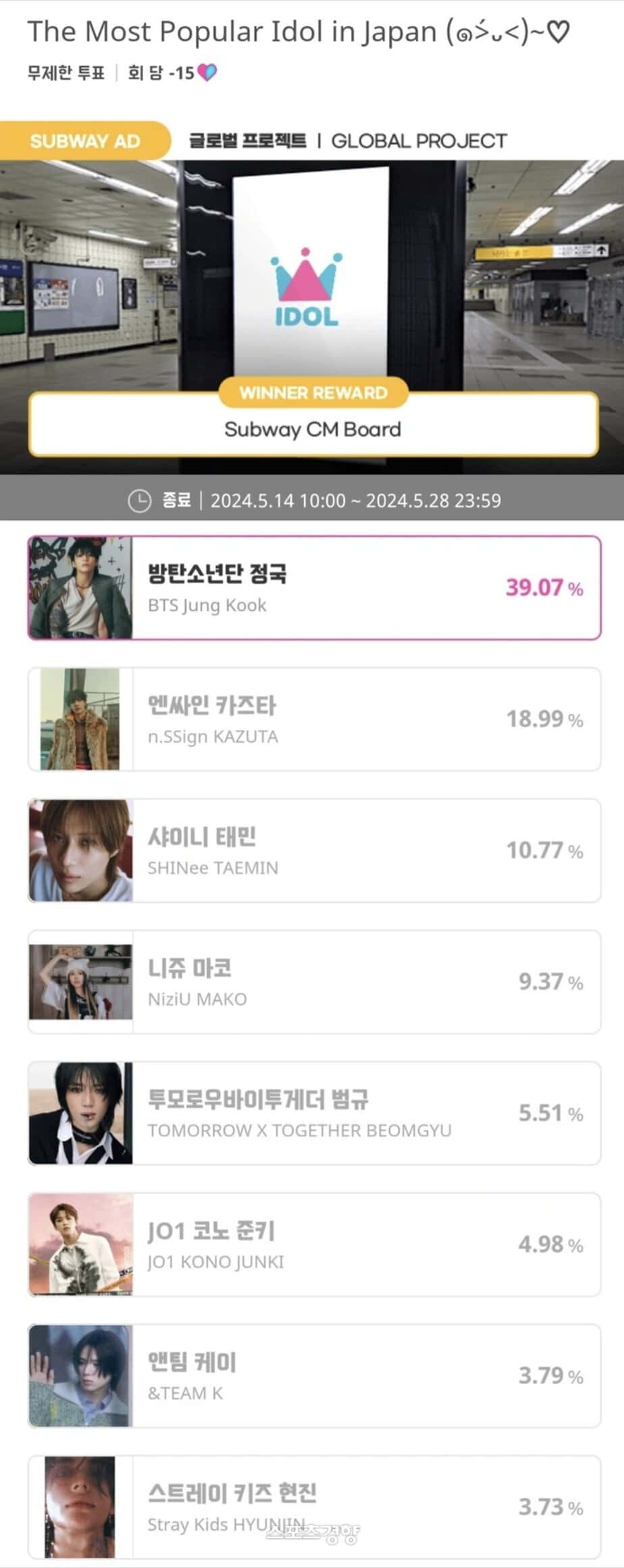 Sonuç olarak BTS’ten Jung Kook %39.07’lik ezici bir oy oranıyla 1. sırada yer aldı.