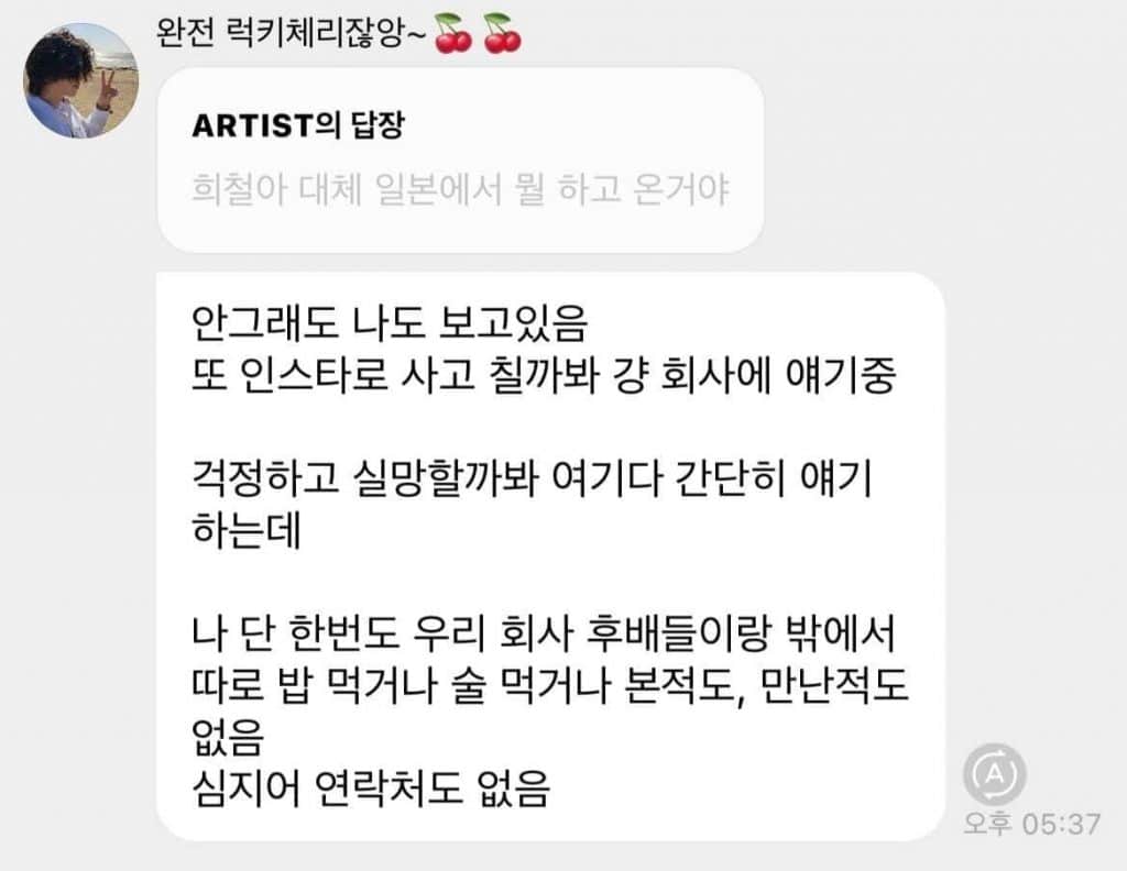 Cevap olarak Kim Heechul, “Söylentileri ben de gördüm. Instagram’da herhangi bir kazayı önlemek için bunu şirketle görüşüyorum.” dedi.
