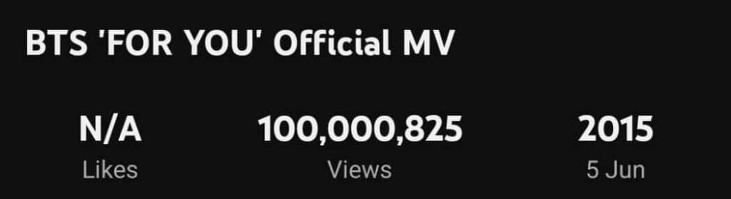 29 Haziran günü saat 16.30 civarında BTS‘in 2015’te yayımladığı Japonca şarkısı FOR YOU‘nun müzik videosu YouTube’ta 100 milyon izlenme sayısını aştı.