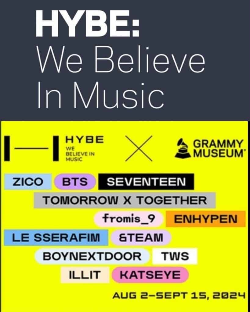 BTS, SEVENTEEN, TXT, LE SSERAFIM, ENHYPEN ve daha fazla HYBE sanatçısının eserleri, 2 Ağustos’tan 15 Eylül’e kadar Los Angeles’taki Grammy Müzesi’nde sergilenecek.