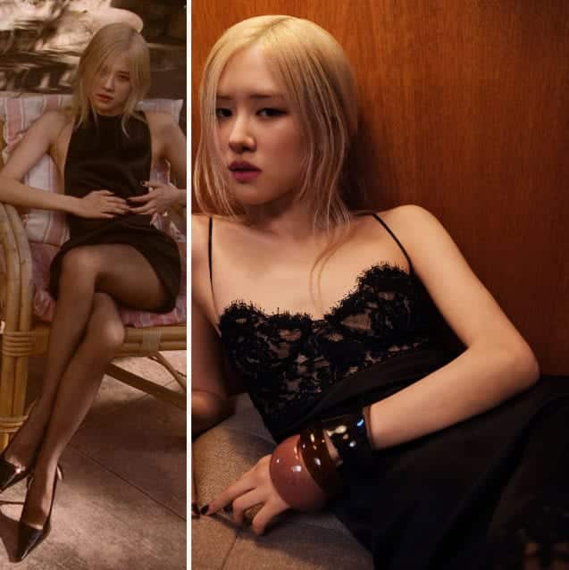 Rosé, Saint Laurent‘in lüks ve trend kıyafetleriyle büyüleyici pozlar verdi. Feminen ve çekici bir alçak topuz saç stili ve nude turuncu makyajla tamamlanan görünümü, sanatçının benzersiz karizmasını vurguladı. İki askılı dantel elbise ve vücut hatlarını ortaya çıkaran siyah bir bodysuit ile Rosé, uzun bacaklarını ve model fiziğini gözler önüne serdi.