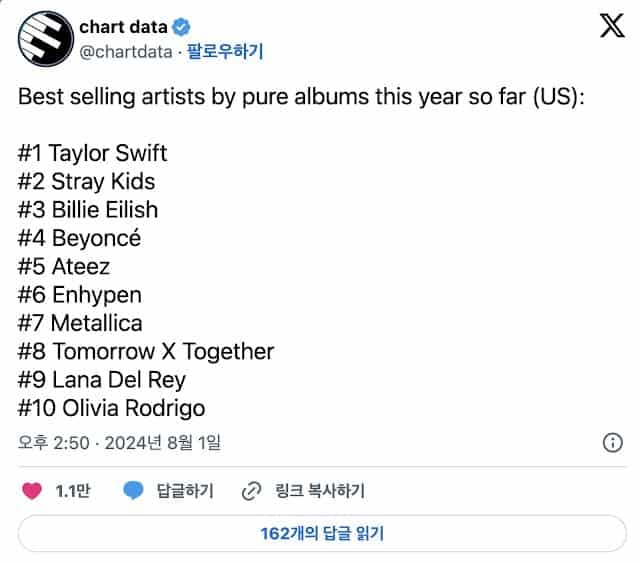 #10 Olivia Rodrigo— chart data (@chartdata) August 1, 2024