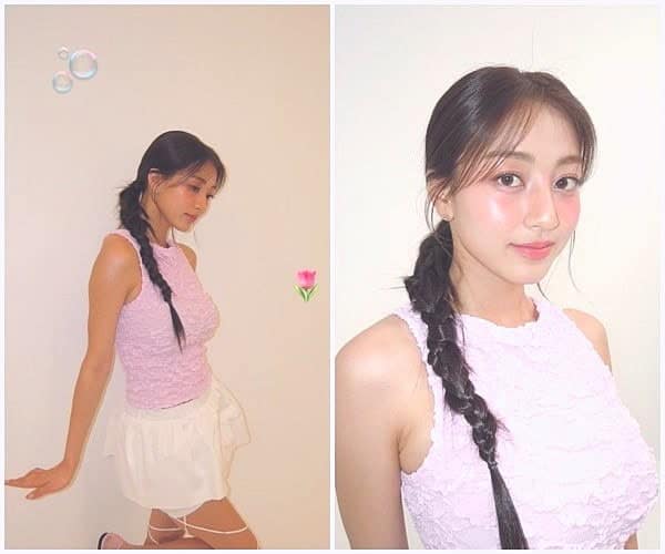Fotoğraflarda Jihyo, saçları bir tarafa örülmüş halde saf ve masum bir görünüm sergiliyor. Pembe dantel süslemeli kolsuz bir üst ve beyaz bir etek giyerek zarif bir görüntü oluşturuyor. Pembe allık, taze ve canlı görünümünü vurguluyor.
