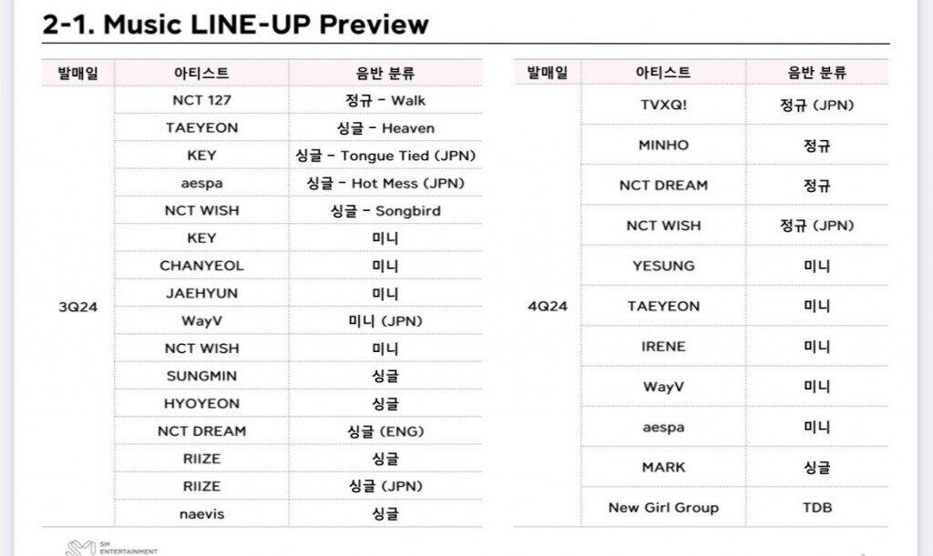- çeyrekte ise TVXQ!, MINHO, NCT DREAM, NCT WISH, Yesung, Taeyeon, Irene, WayV, aespa ve Mark‘ın yanı sıra yeni bir kız grubunun debut yapması planlanıyor.