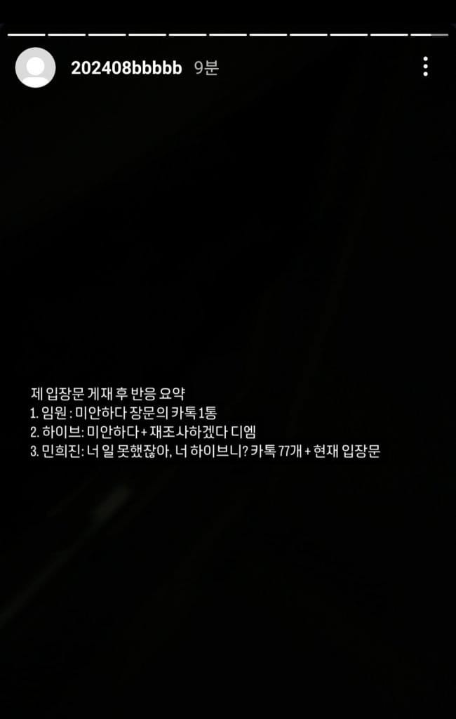 ADOR‘un eski çalışanı B, Instagram hikayesinde yaptığı açıklamanın ardından gelen tepkileri özetledi. Şirket yöneticisinden özür dileyen uzun bir KakaoTalk mesajı aldığını, HYBE‘ın özür dileyip yeniden soruşturma başlatacağını bildirdiğini açıkladı. Min Heejin‘in ise 77 adet KakaoTalk mesajı gönderdiğini ve şu anki açıklamasını yaptığını belirtti.