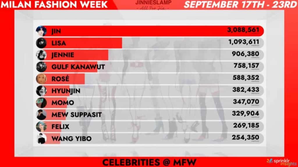 Jin, küresel müşteri deneyimi yönetim platformu Sprinklr tarafından 3 milyondan fazla övgüyle Milan Moda Haftası‘nda En Çok Bahsedilen Ünlü sıralamasında dünyada ilk sırada yer aldı. (24 saat sonra 4 milyondan fazla bahsedilme alarak en çok bahsedilen ünlü olmaya devam ediyor.)