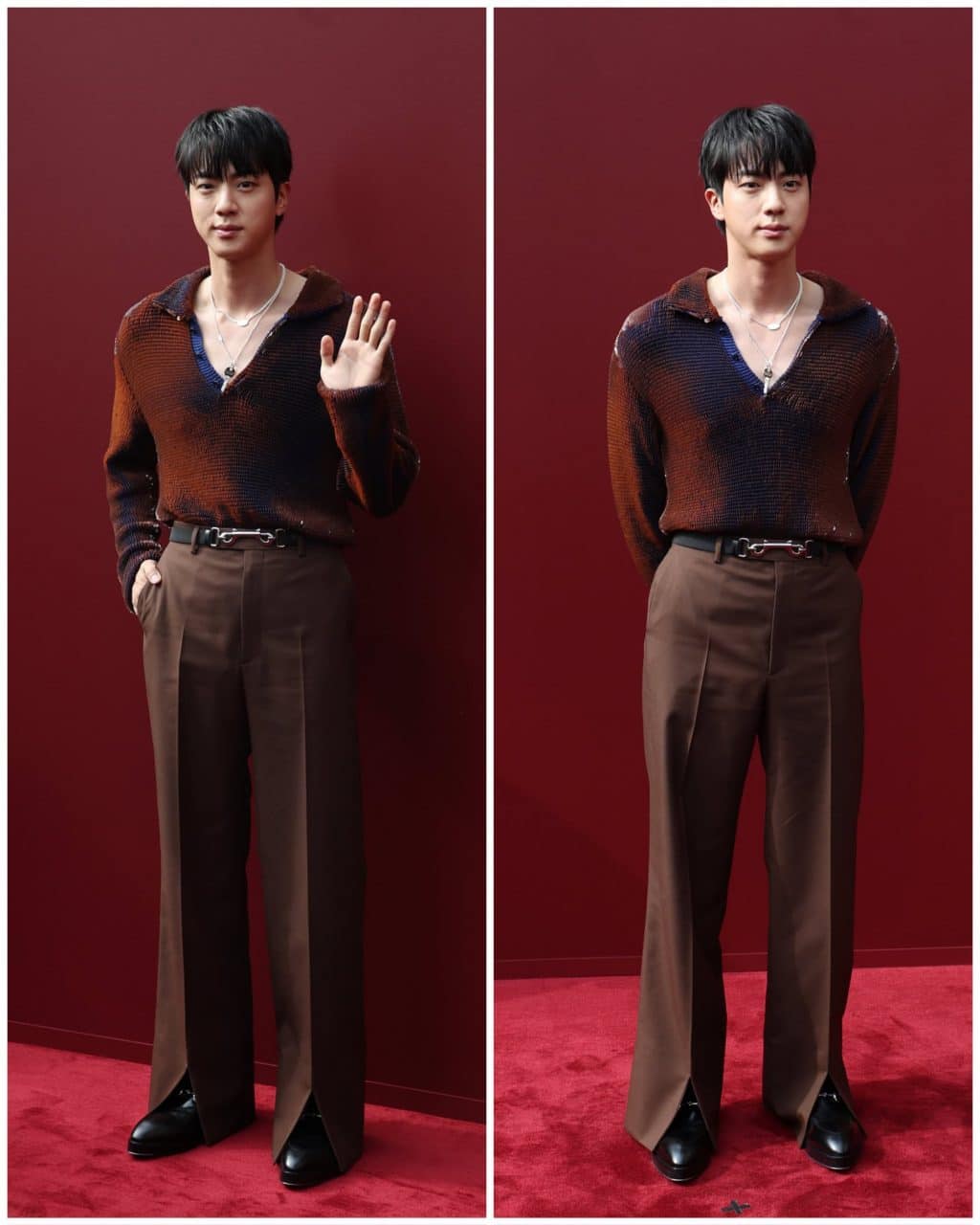 Global idol, İtalya’nın Milan kentinde muhteşem görünümüyle başları döndürdü. Jin, kahverengi pantolonla kombinlediği kahverengi mavi V yakalı bir kazakla görüldü. Kıyafetini gümüş takılarla tamamladı.